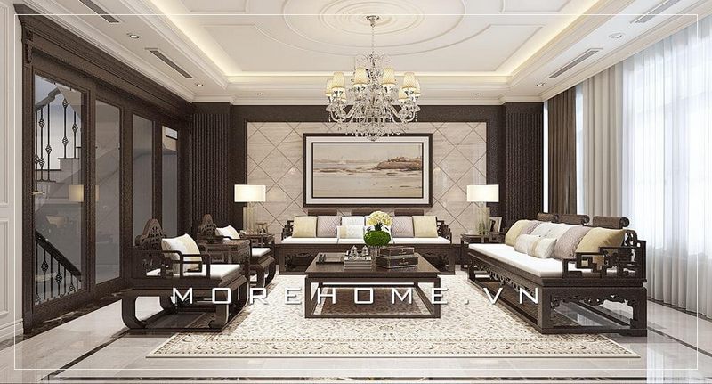 Thiết kế phòng tiếp khách sang trọng cho nhà phố, biệt thự cao cấp phong cách gỗ việt tân cổ điển thể hiện đẳng cấp cho gia chủ